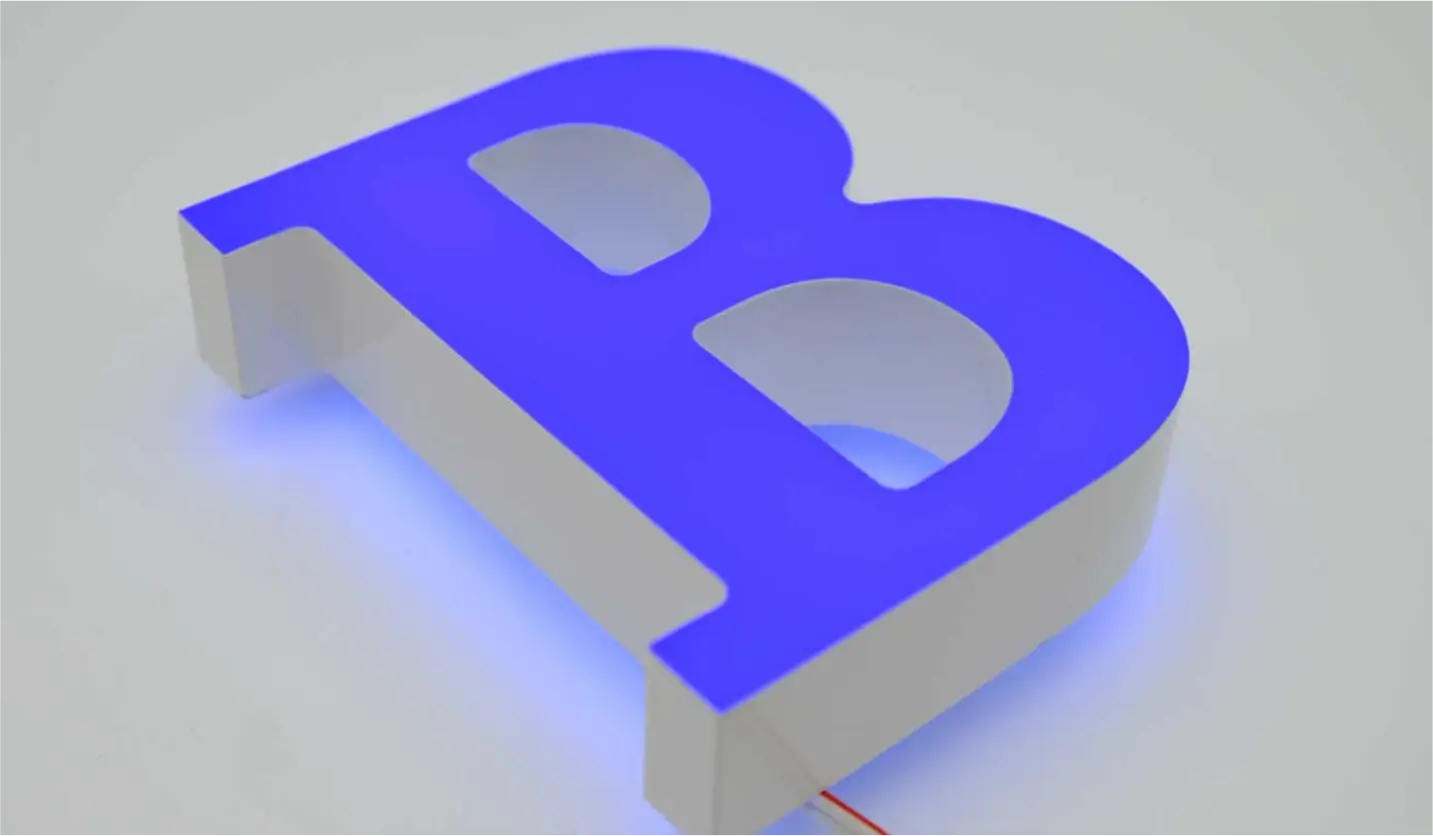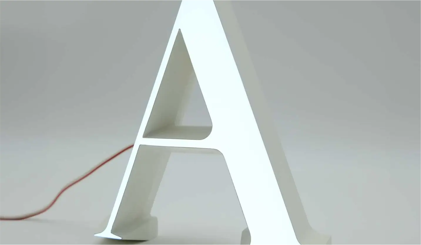Lichtaustritt am hinteren Seitenbereich des Buchstabens. Frontseite und der vordere Teil der Seiten kann individuell ausgestaltet und lackiert werden.