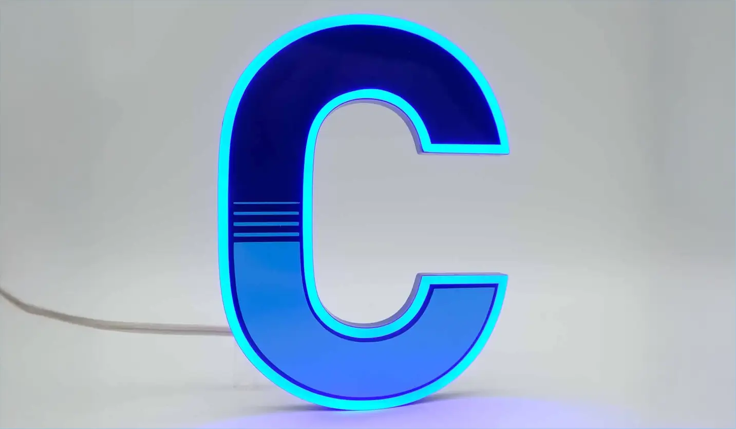 Lichtaustritt am vorderen Seitenbereich des Buchstabens. Frontseite und der hintere Teil der Seiten kann individuell ausgestaltet und lackiert werden.